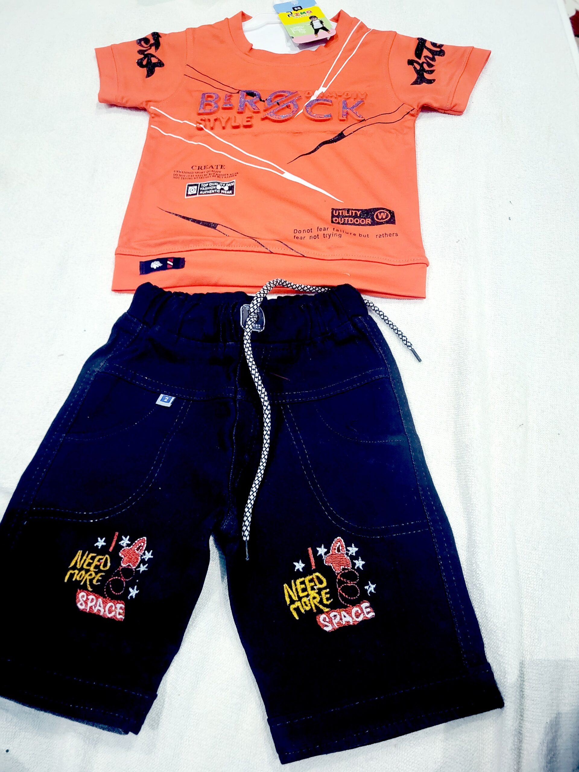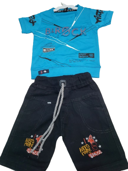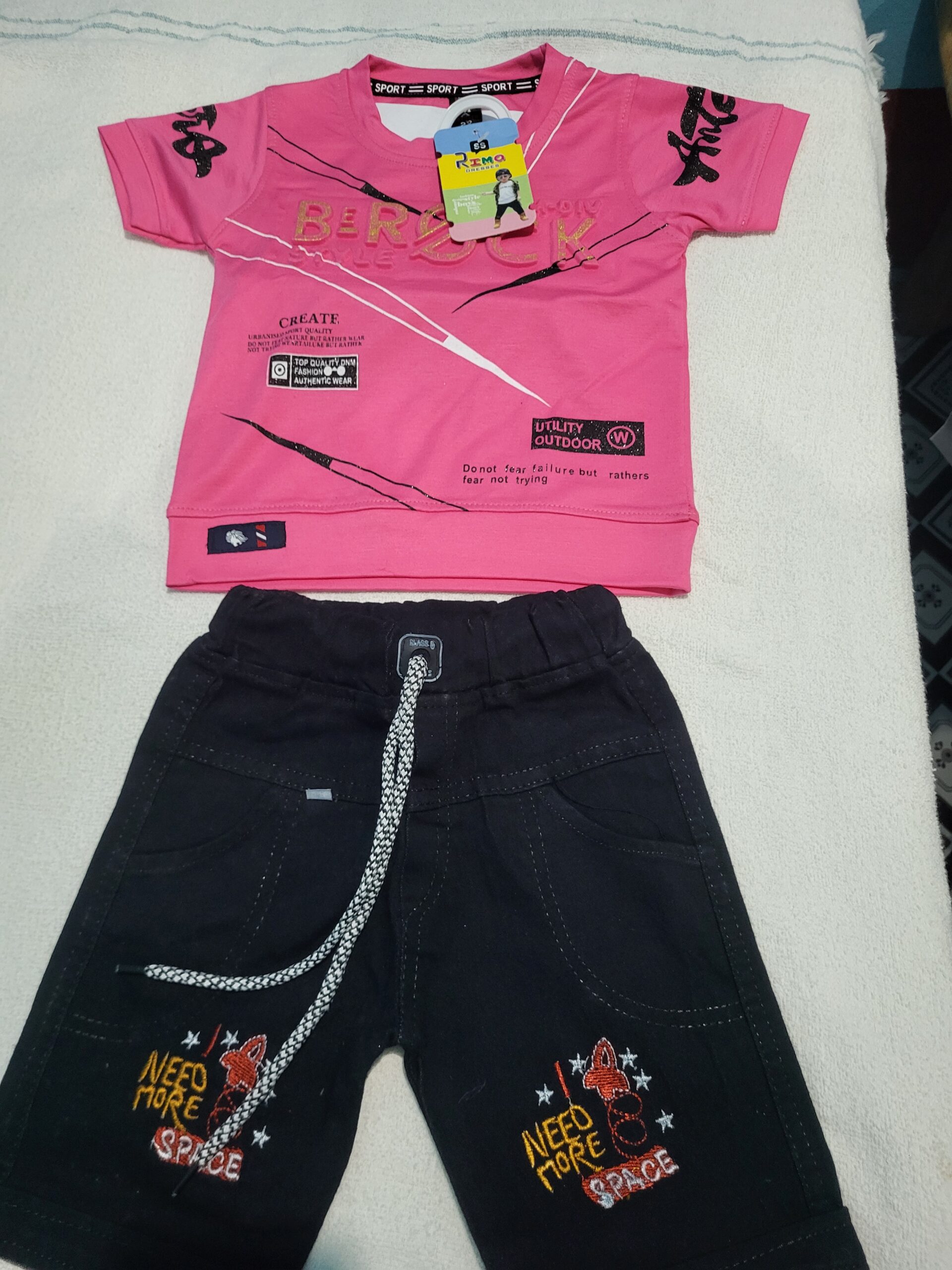 Dress your little champ in this cool and comfy 2-piece outfit set, perfect for summer days! The set includes a vibrant pink t-shirt with sporty prints and a pair of black shorts featuring fun “Need More Space” embroidery.